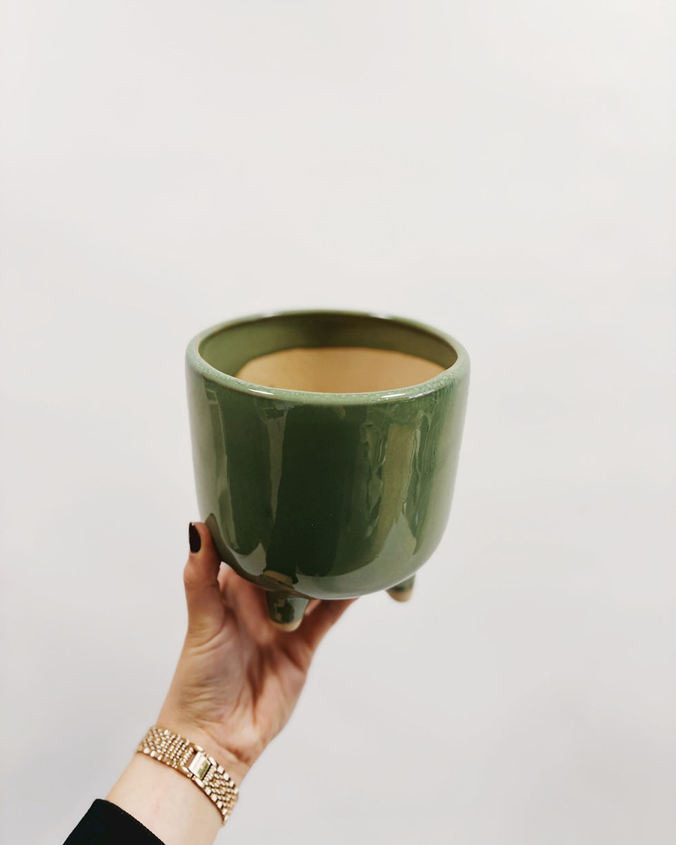 smukła, urocza osłonka w odcieniu zieleni z beżowym chropowatym paseczkiem na niskiej nóżce; ziemisty odcień zieleni pięknie podkreśli zarówno rośliny zielone, jak i kolorowe odcienie kwiatów domowych, a osłonka ta odnajdzie się dobrze zarówno w klasycznej kolekcji, jak również wśród wzorzystych, kolorowych doniczek;
